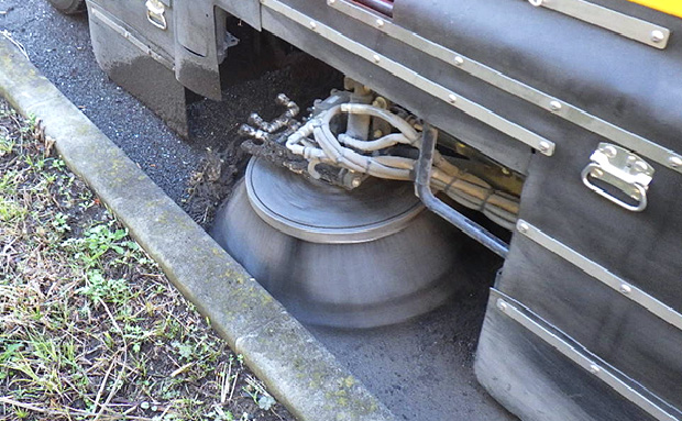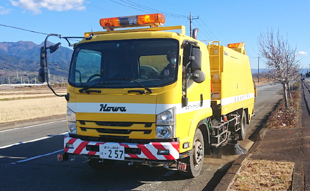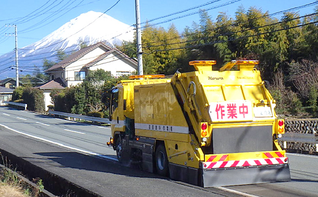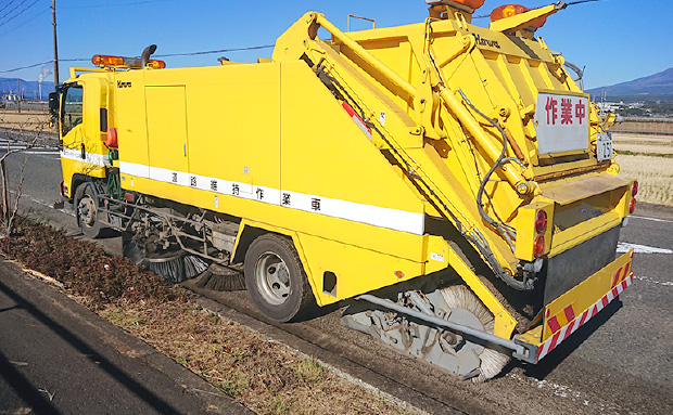 高速道路・一般道路・工場構内・駐車場の舗装面のゴミ、土砂などをブラシ式路面清掃車で清掃します。