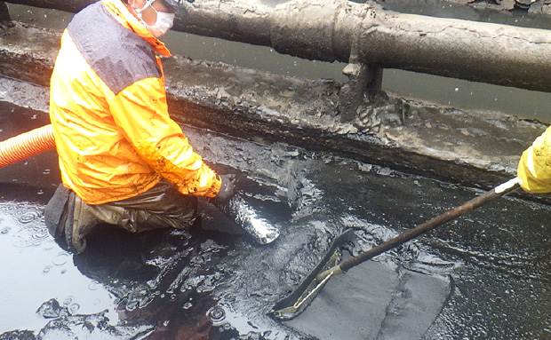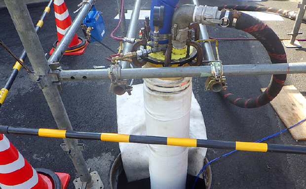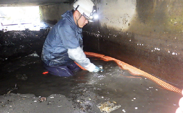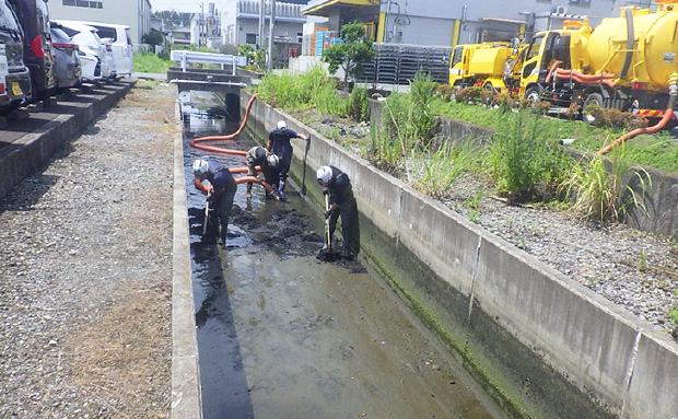 高圧洗浄車により排出された土砂等を吸引車で吸引します。