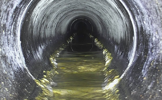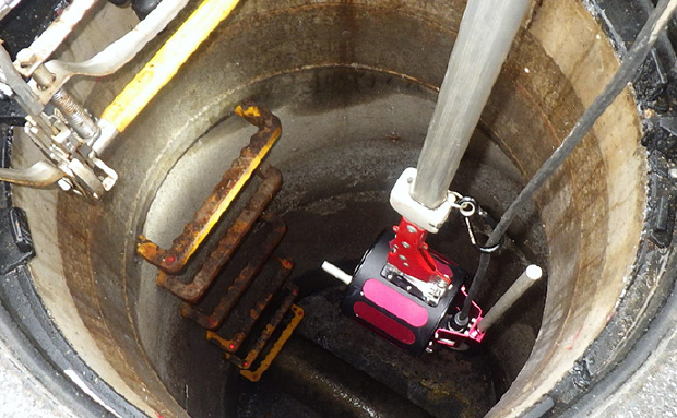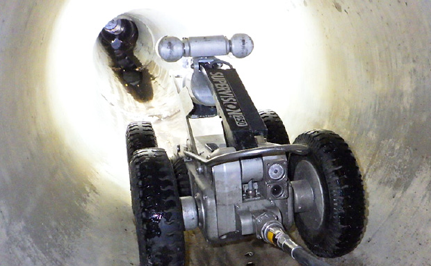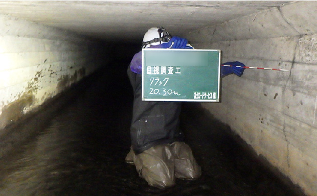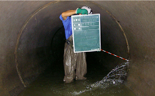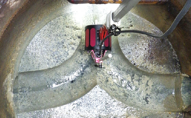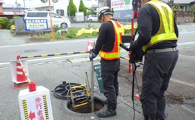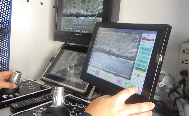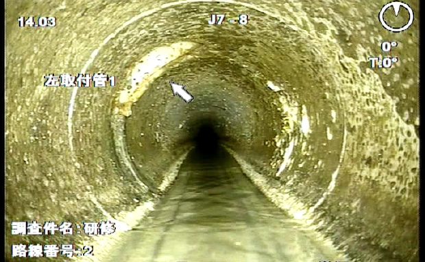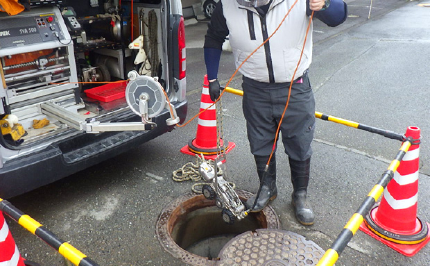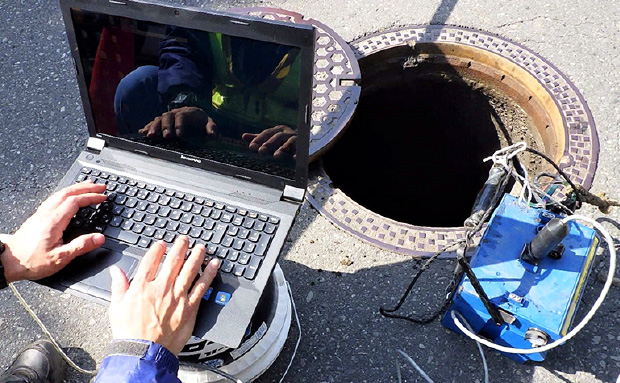 自走式ロボットカメラを使い、管路内状況を調査します。