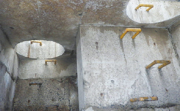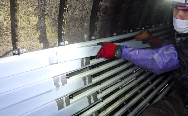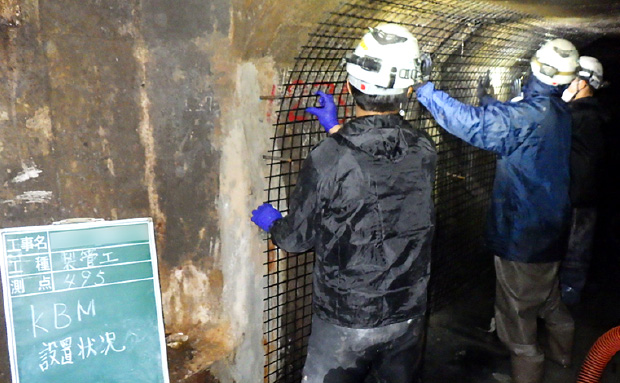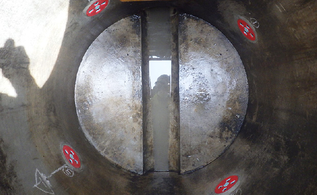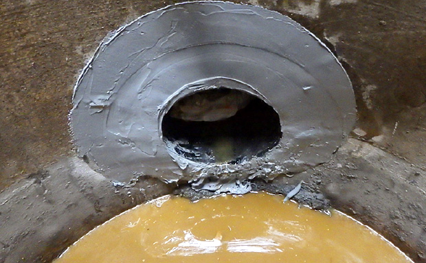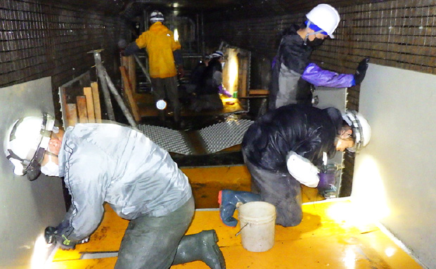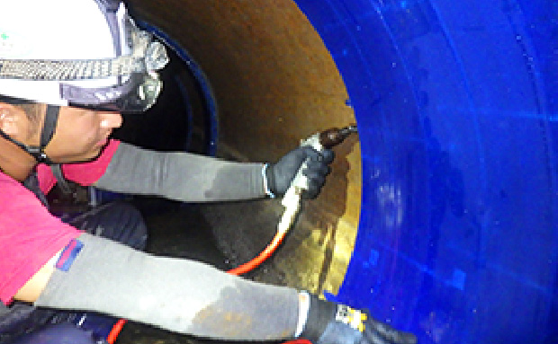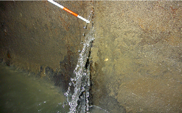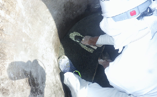 クリスタルライニング工法は、防食性を有する無溶剤型エポキシ樹脂モルタルをコンクリート構造物に塗布し、止水(溶接補強型止水工)、防食(塗布型ライニング工)、補強(補強ライニング工)、マンホールの耐震補強を行う、機械を使用しない人力施工による工法です。