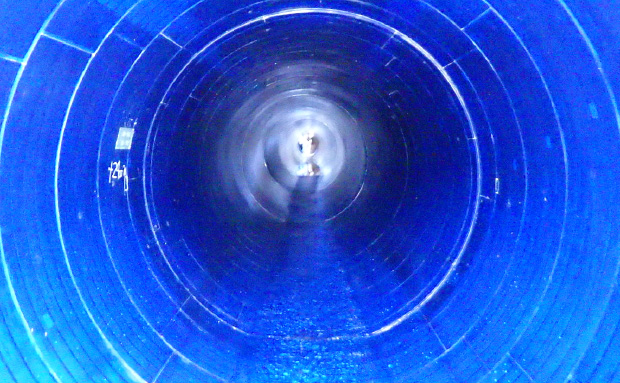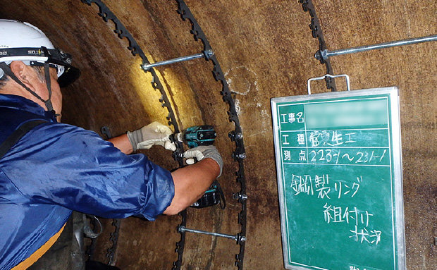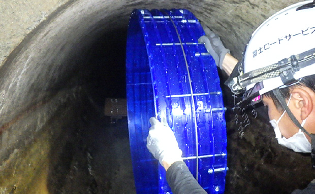 3Sセグメント工法は、透明で軽量なプラスチック製セグメントをボルトナットで組み立てます。その後既設管と3Sセグメント材との間に充填剤を注入し一体化した複合管を構築する工法です。