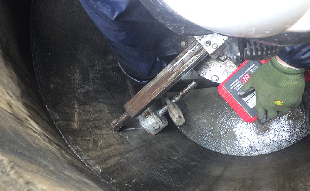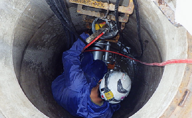 既設人孔耐震化工法は、専用の切削機によりマンホール内の壁を管外周に沿って切削することで、マンホールと管の縁を切ります。 切削した溝には土砂等の流入を防止するバックアップ材、地下水の流入を防止する、シーリング材を充填し、接続部の耐震化を行うものです。