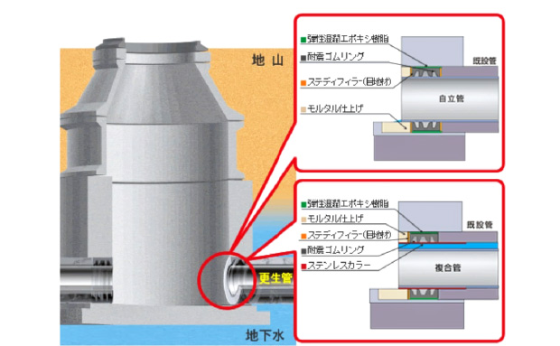 更生管のマンホール接続部に、レベル2地震動による抜け出し、突き出し、屈曲等に対する耐震性能を付加するため、更生前にマンホール接続部をフレキシブルな構造に改造する非開削の耐震化工法です。